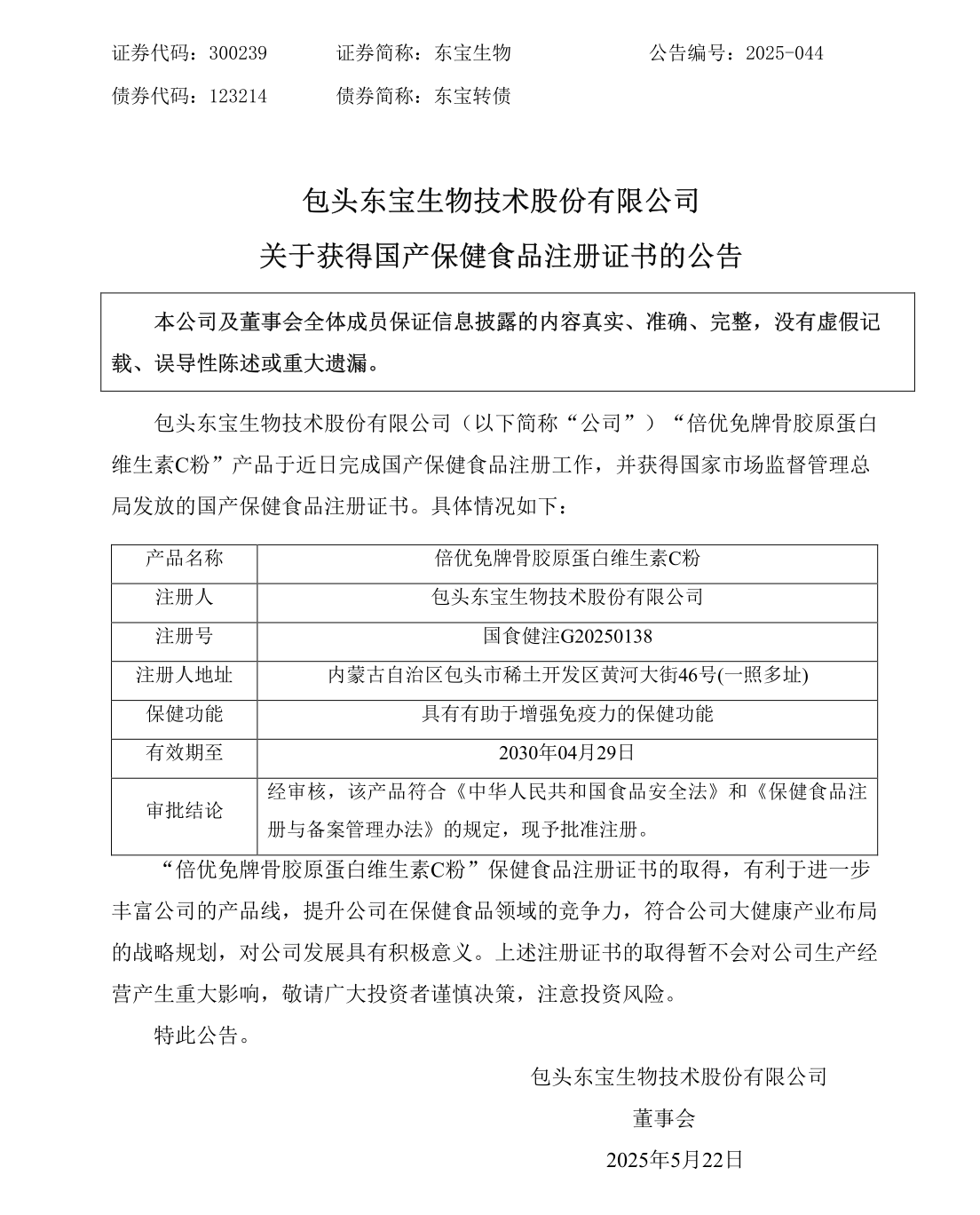 5月22日,東寶生物(證券代碼:300239)發布公告,近日公司完成了“倍優免牌骨膠原蛋白維生素C粉”產品的國產保健食品注冊工作,并獲得了國家市場監督管理總局發放的注冊證書,注冊號為國食健注G20250138。該產品具有增強免疫力的保健功能,有效期至2030年4月29日。公司表示,此次注冊證書的取得有利于進一步豐富公司的產品線,提升在保健食品領域的競爭力,符合公司在大健康產業布局的戰略規劃,對公司發展具有積極意義。