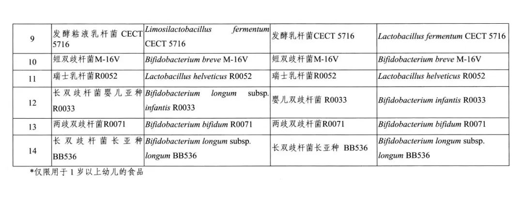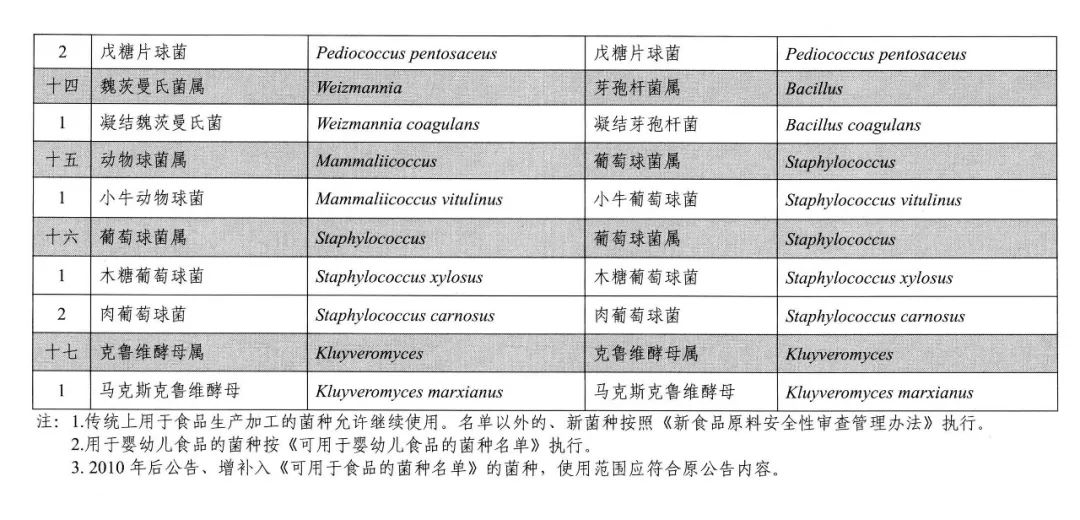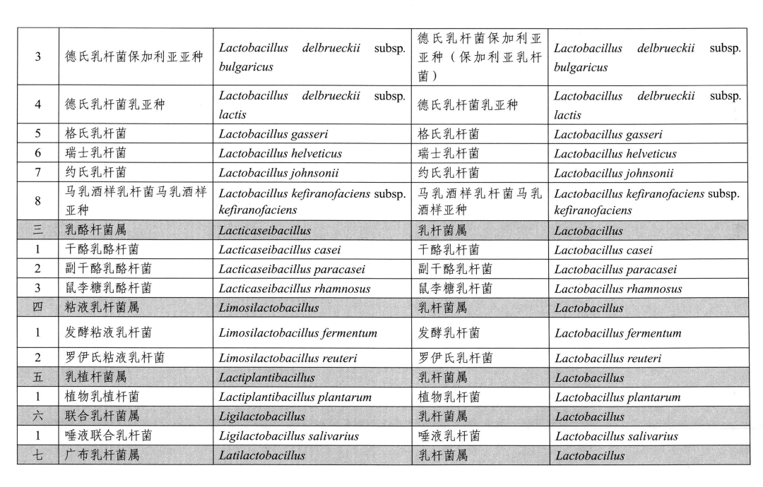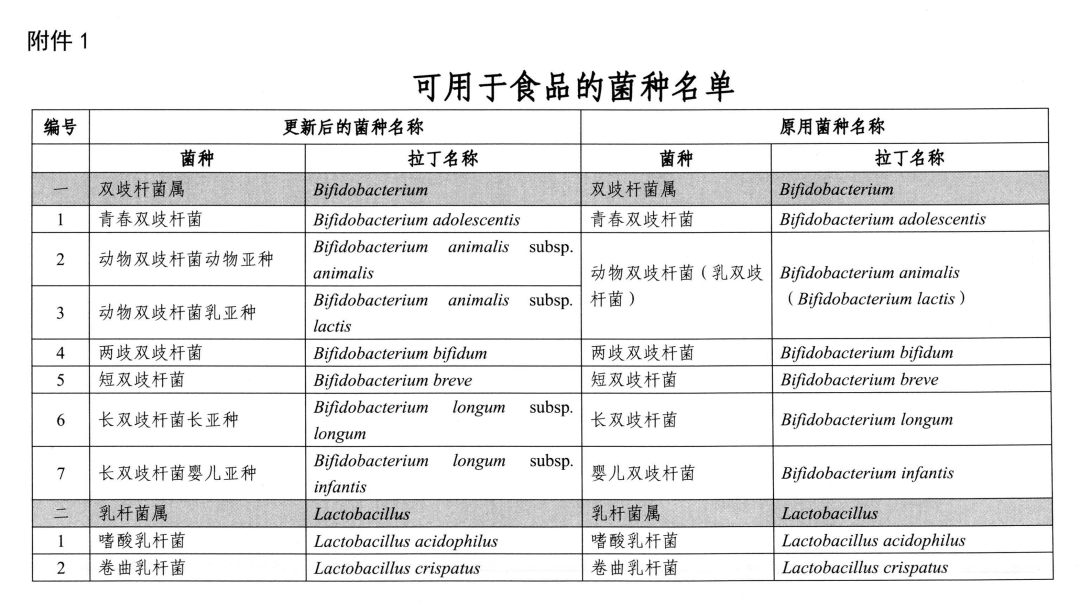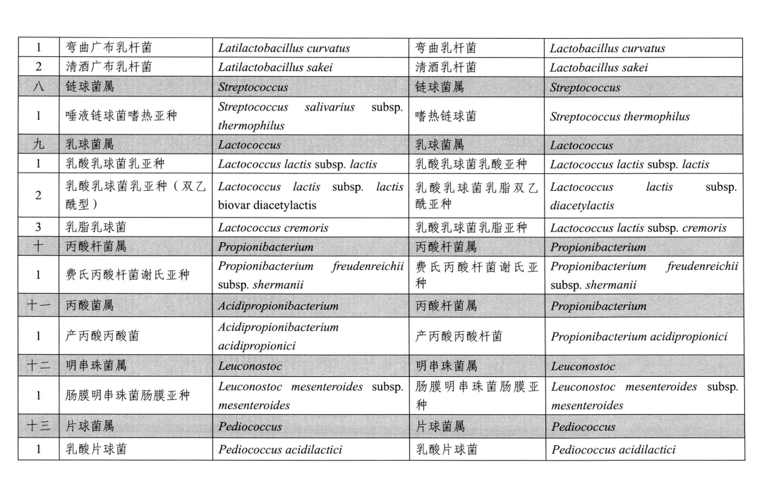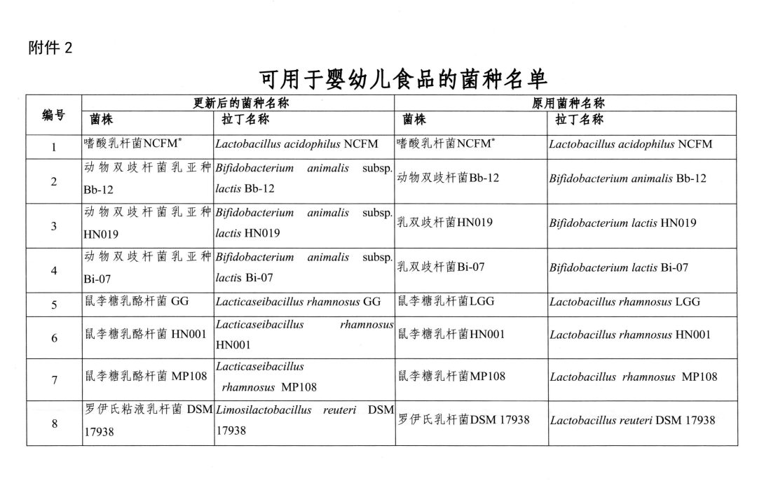 (二)根據國際有關菌種分類地位的變化情況,《可用于食品的菌種名單》及《可用于嬰幼兒食品的菌種名單》中12個菌種更新為不同種屬。