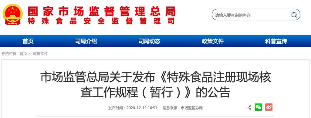 為規范特殊食品注冊現場核查工作,依據《中華人民共和國食品安全法》《保健食品注冊與備案管理辦法》《嬰幼兒配方乳粉產品配方注冊管理辦法》《特殊醫學用途配方食品注冊管理辦法》等法律規章,市場監管總局制定了《特殊食品注冊現場核查工作規程(暫行)》,現予發布,自公布之日起施行。