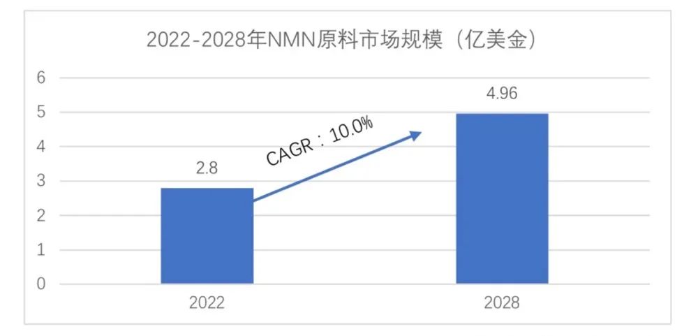 美國的市場研究公司(GlobeNewswire)的數據顯示,2022年全球NMN的原料市場銷售額預估為2.8億美金,其預測到2028年,NMN的原料銷售額將達到4.96億美金,年復合增長率達到10.0%[1]。主要的供應商包括基因港(GeneHarbor)、霍伯麥(Herbalmax)、日本新和制藥(Shinkowa)和音芙醫藥(EffePharm)。四家的原料合計占比達到了83%的市場占有率。