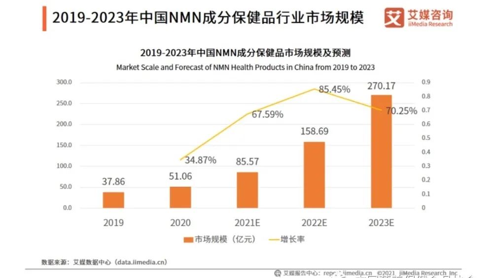 中國作為NMN的最大消費市場,依據艾媒數據中心數據,2020年含NMN成分食品的市場規模達51.06億元,同比增長34.87%,預計到2023年將會以近70.25%的增速攀升至270.13億元,行業發展速度較快[2]。市場規模和增長率如下圖所示。