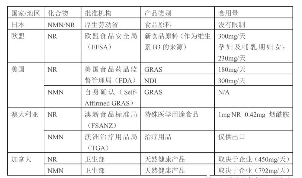 從中可以看出,NR在歐盟、美國、日本都基本批準作為食品原料,其相當于維生素B3(煙酸)的一個來源。NMN在日本、美國作為食品原料進行管理。NMN/NR在加拿大都是作為天然健康產品進行管理。