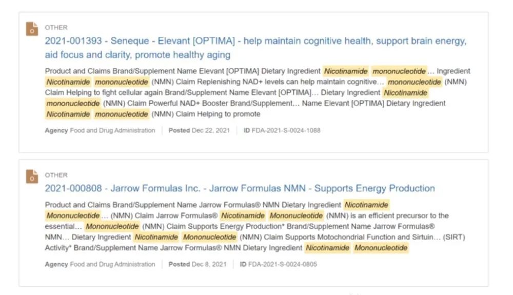 從中可以看出,編號為1234和1240的兩個申請都是NMN的申請,FDA也對此申請進行了相應的回復。