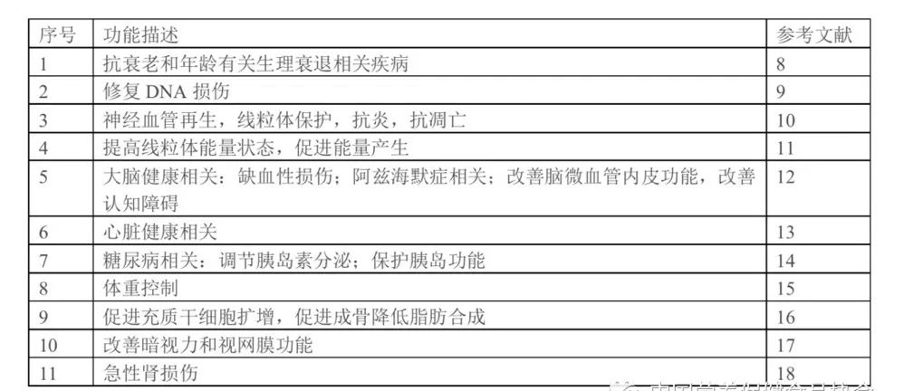近幾年,有關NMN生物學功能的研究日益增加[8,9-18],如:改善與年齡有關的病理生理和疾病狀況,明顯減輕與年齡相關的生理衰退,改善細胞能量狀態、神經系統、大腦認知(阿茲海默)等,并對心臟病、糖尿病等諸多疾病情況的改善顯示出良好效果。整理如下表所示。