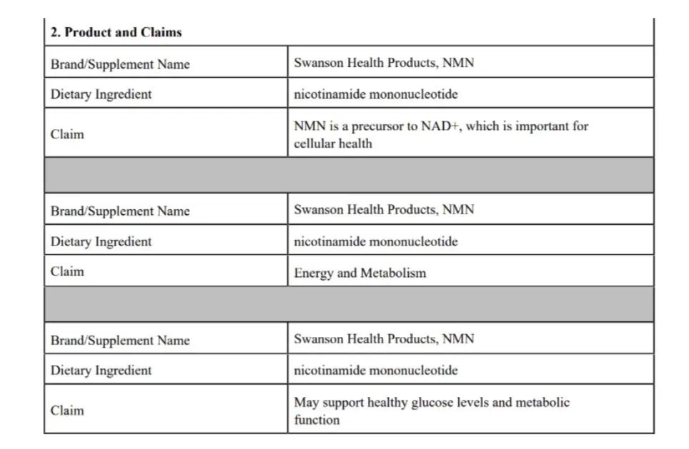 我們下載了一個美國FDA中Swanson Health Products, NMN的結構/功能申請[19],截圖如下: