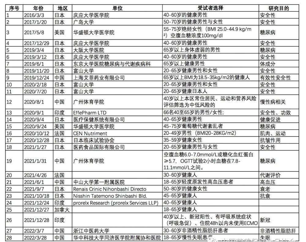 如上面提到,安全性作為食品的重要指標,NR在全球主要國家及地區已經批準作為食品原料,其安全性已經得到了相關的證明。NMN作為一個新的原料,目前已經被日本批準作為食品原料,在其他主要國家和地區可以作為膳食補充劑原料,說明其安全性已經得到了一定的驗證。但是對于人體的安全性數據還是比較少的,目前全球范圍內對于NMN的臨床實驗很多涉及到安全性評估和其他相關功能評估。我們整理了目前全球范圍內涉及到NMN的臨床研究,結果如下表所示。