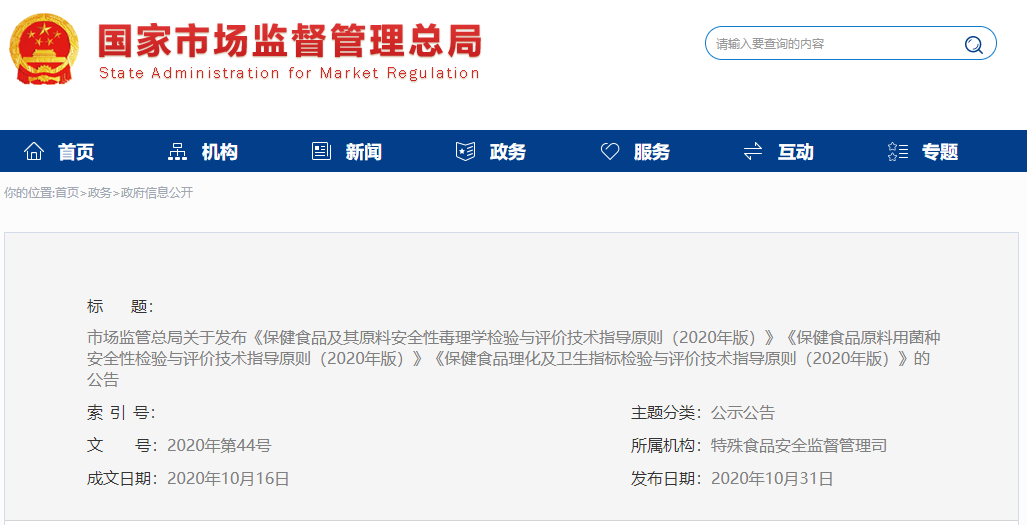 根據(jù)《中華人民共和國食品安全法》,經(jīng)與國家衛(wèi)生健康委協(xié)商一致,市場監(jiān)管總局制定了《保健食品及其原料安全性毒理學(xué)檢驗(yàn)與評價(jià)技術(shù)指導(dǎo)原則(2020年版)》《保健食品原料用菌種安全性檢驗(yàn)與評價(jià)技術(shù)指導(dǎo)原則(2020年版)》《保健食品理化及衛(wèi)生指標(biāo)檢驗(yàn)與評價(jià)技術(shù)指導(dǎo)原則(2020年版)》,現(xiàn)予印發(fā),自公告之日起施行。