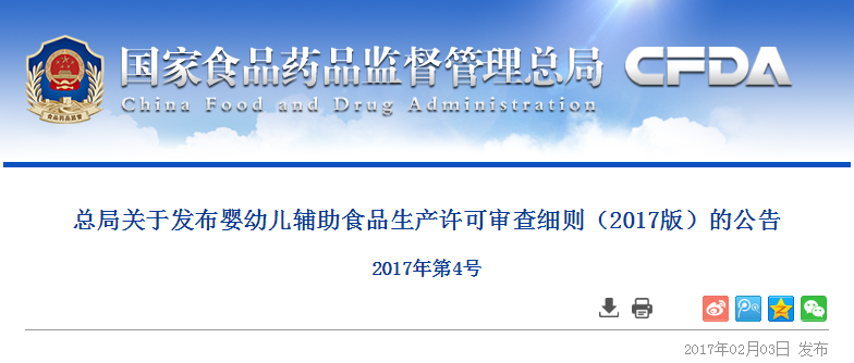 為做好嬰幼兒輔助食品生產許可審查工作,規范嬰幼兒輔助食品生產加工活動,根據《中華人民共和國食品安全法》及其實施條例、《食品生產許可管理辦法》(國家食品藥品監督管理總局令第16號)等有關規定,國家食品藥品監督管理總局組織制定了《嬰幼兒輔助食品生產許可審查細則》(2017版),現予發布,自發布之日起施行。
