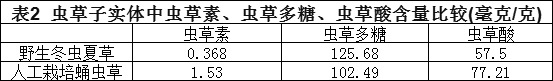 由表2可知:蟲(chóng)草素、蟲(chóng)草多糖、蟲(chóng)草酸這些是蟲(chóng)草中用于醫(yī)學(xué)發(fā)揮藥理作用的主要有效成分,蛹蟲(chóng)草依然有很好的表現(xiàn)。分析結(jié)果表明,人工栽培的蛹蟲(chóng)草中,蟲(chóng)草素含量是野生的4.17倍,蟲(chóng)草素、蟲(chóng)草酸含量均顯著高于野生冬蟲(chóng)夏草;蟲(chóng)草多糖含量略低于野生冬蟲(chóng)夏草。