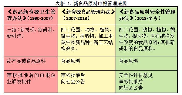 中國對于新食品原料的管理相比于歐美發達國家地區相對較晚,但是正在一步步地趨于成熟,總體而言有三個階段(表格 1)。