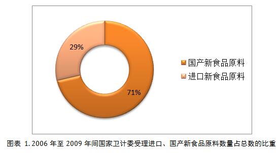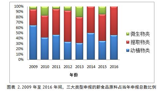 通過對國家衛生計生委衛生行政許可公眾查詢數據庫的信息檢索分析后,筆者發現2009年至2016年共七年間,截至2016年10月28日,國家衛計委共公開受理新食品原料申報251件,其中29%申報的新食品原料為進口,71%的為國產 (圖表 1)。絕大多數申報的新食品原料為中國本土資源,側面體現了我國有豐富的資源值得食品行業開發和利用。