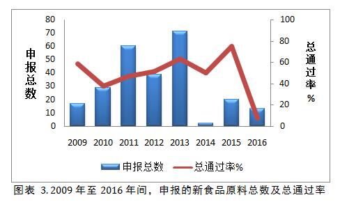 從《新資源食品管理辦法》(2007)頒布到其被《新食品原料安全性審查管理辦法》(2013)取代期間,整體而言新資源食品無論是申報數量還是通過率均呈上升趨勢。2009年至2011年間,新資源的申報數量逐年增長,第三年的申報數量是第一年的近4倍,可見各路食品企業在《新資源食品管理辦法》的政策引導下對于開發新資源食品的熱情一路高漲。