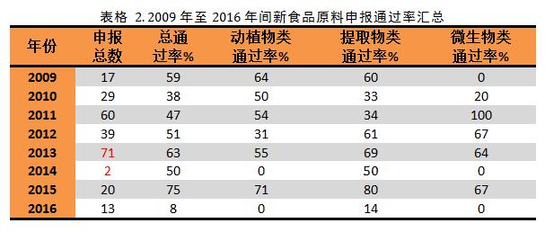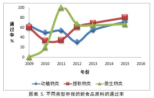 申報的不同類型的新食品原料通過率確實大相徑庭。總體來看,提取物類和動植物類的新食品原料的通過率在近7年內趨勢相似且穩中有升。2009年至2011年間,申報動植物類的通過率略高于提取物類;2012年之后,提取物類的新食品原料通過率一直高于動植物類;2009年申報的微生物類的新食品原料截至目前沒有任何獲得公告或通過專家評審會,但是在隨后的兩年內申報的微生物新食品原料通過率一路高歌,2011年3個申報的微生物類新食品原料全部獲得國家衛計委新食品原料的公告(表格 3)。隨后的幾年中,申報微生物類新食品原料的通過率相比于2011年雖有下降,但仍然保持在較高的水平,與提取物和動植物類的通過率不相上下。2015年申報的提取物類、動植物類和微生物類的新食品原料的通過率分別為80%,71%,和67%。可以看出,各路企業對于新法規和政策的理解與執行進一步加強,申報質量穩步提高。