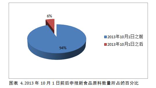 《新食品原料安全性審查管理辦法》于2013年2月5日經原衛生部部務會審議通過,自2013年10月1日起施行。換言之,2013年10月1日以后,國家將按照新的審查管理辦法來管理新食品原料申報。新的政策初步執行階段,國家會在相當一段長的時間內展開一些法規宣講會和政策解讀會,幫助企業、檢測機構、各相關政府部門明確各自的角色和職能,各方從而更快地適應新的法規。這樣的情況下,更多的企業會選擇在新法規頒布前按照舊辦法加速提交申報,而很少有企業在新法規政策執行不明朗的情形下貿然提交申請,做‘第一個吃螃蟹的人’。94%的企業選擇在2013年10月1日前提交申報 (圖表 4),恰好就是企業選擇先觀望的很好的說明,也解釋了為什么2013年成為新食品原料申報的‘黃金年代’。