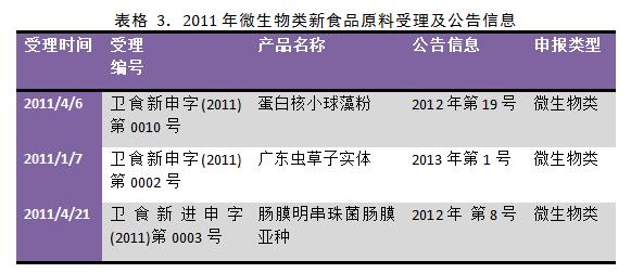 2011年至2013年間,申報微生物類新食品原料所占總申報數量的比重呈階梯式增長,2013年的為2011年的近四倍。2015年申報微生物類新食品原料所占比重雖然比2013年稍有下滑,但與歷年相比該值依舊屬于在較高水平。可以看出微生物類的新食品原料正在逐步成為企業申報新食品原料的新‘寵兒’。 相信隨著國內市場的擴大和研究人員的努力, 未來幾年益生菌將會進一步引導功能性食品的市場潮流。
