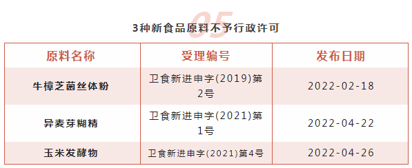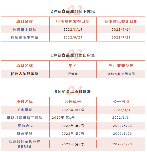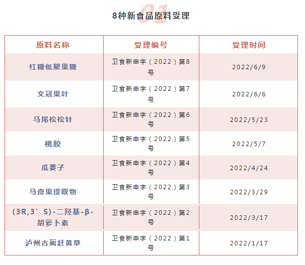 2022年1-7月,國家衛(wèi)生健康委員會(huì)共受理瀘州古藺趕黃草、馬尾松松針、桃膠、紅糖低聚果糖等8種新食品原料;對(duì)假腸膜明串珠菌、 阿拉伯木聚糖2種新食品原料進(jìn)行意見征求;批準(zhǔn)5種新食品原料,分別是關(guān)山櫻花、吡咯并喹啉醌二鈉鹽、萊茵衣藻、長(zhǎng)雙歧桿菌長(zhǎng)亞種BB536、甘蔗多酚;不予行政許可的新食品原料有3種,分別是牛樟芝菌絲體粉、異麥芽糊精、玉米發(fā)酵物。