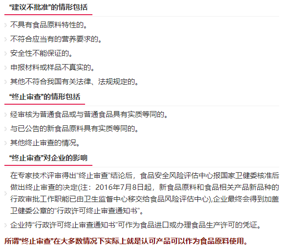 依據《新食品原料安全性審查規程》,新食品原料審查和批準共涉4類情形:“延期再審”、“建議不批準”、“終止審查”和“建議批準”。