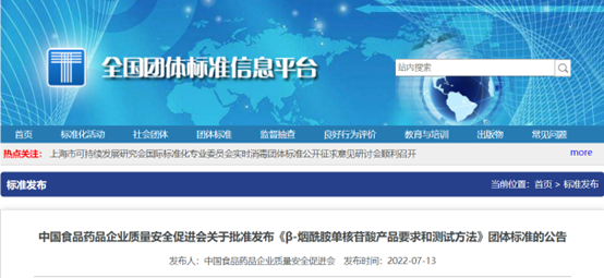 2022年7月13日,中國食品藥品企業質量安全促進會發布β-煙酰胺單核苷酸(NMN)產品要求和測試方法團體標準,適用于進出口原料β-煙酰胺單核苷酸產品的質量控制,將于2022年8月12日正式實施。這是國內首個NMN產品標準正式公布,填補了國內空白。